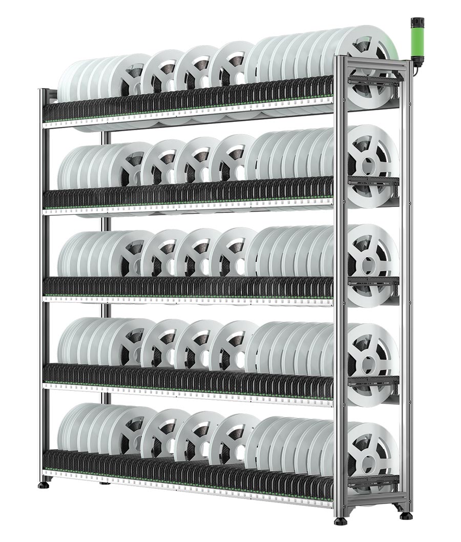 A型智能料架為標準7寸料盤存儲料架,雙面存放,1400個儲位,單色,多色可選,最大可支持7色