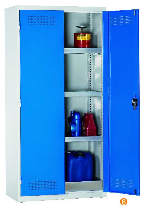 用于污染液體的存儲,可調式隔板,上下25mm可調 可移動式底部貯存盤高100mm,無縫焊接,更好防泄漏 門板的頂部及底部帶通風孔,自然通風,門開啟角度12。 隔板/貯存盤式層板每層最大承重60KG (可抽出式除外) 柜體最大承重承重:300KG